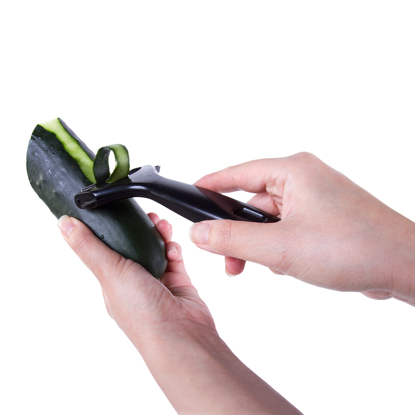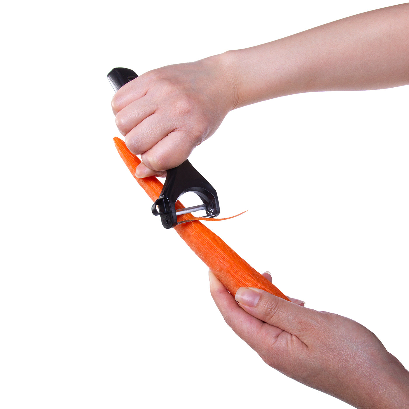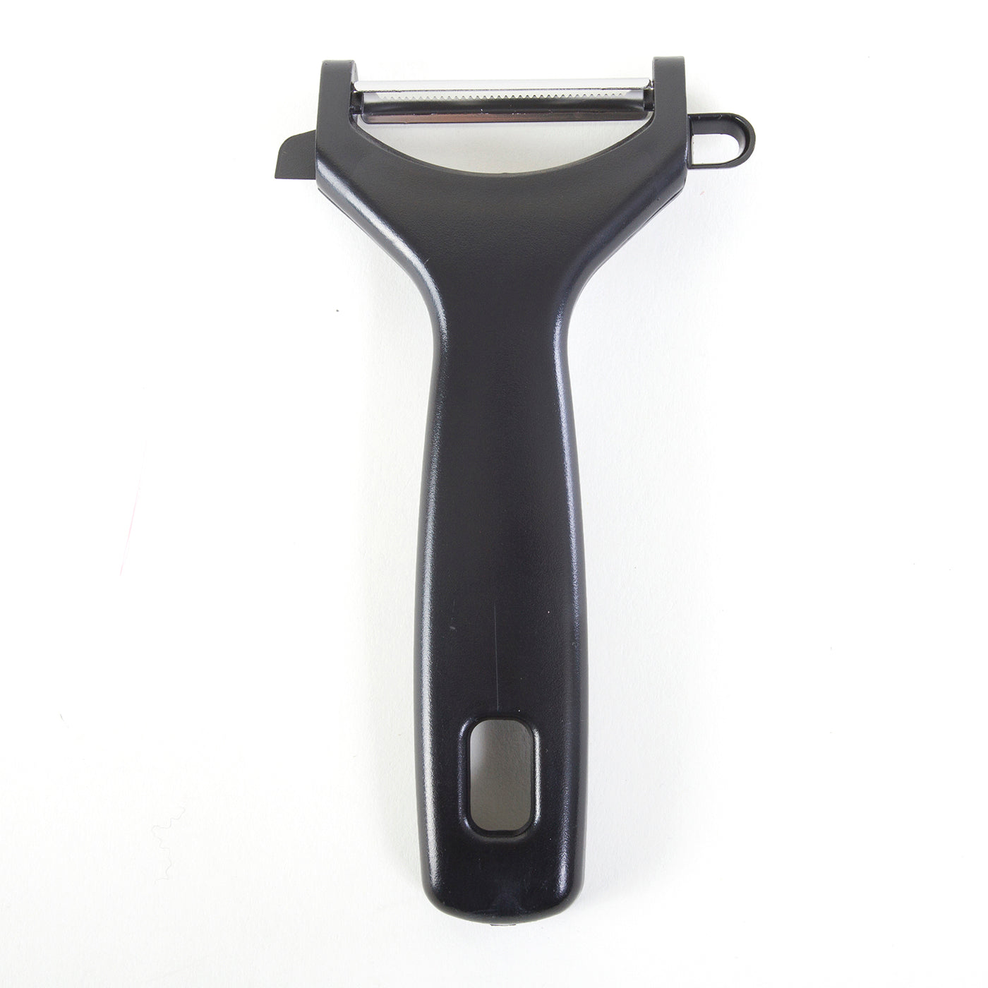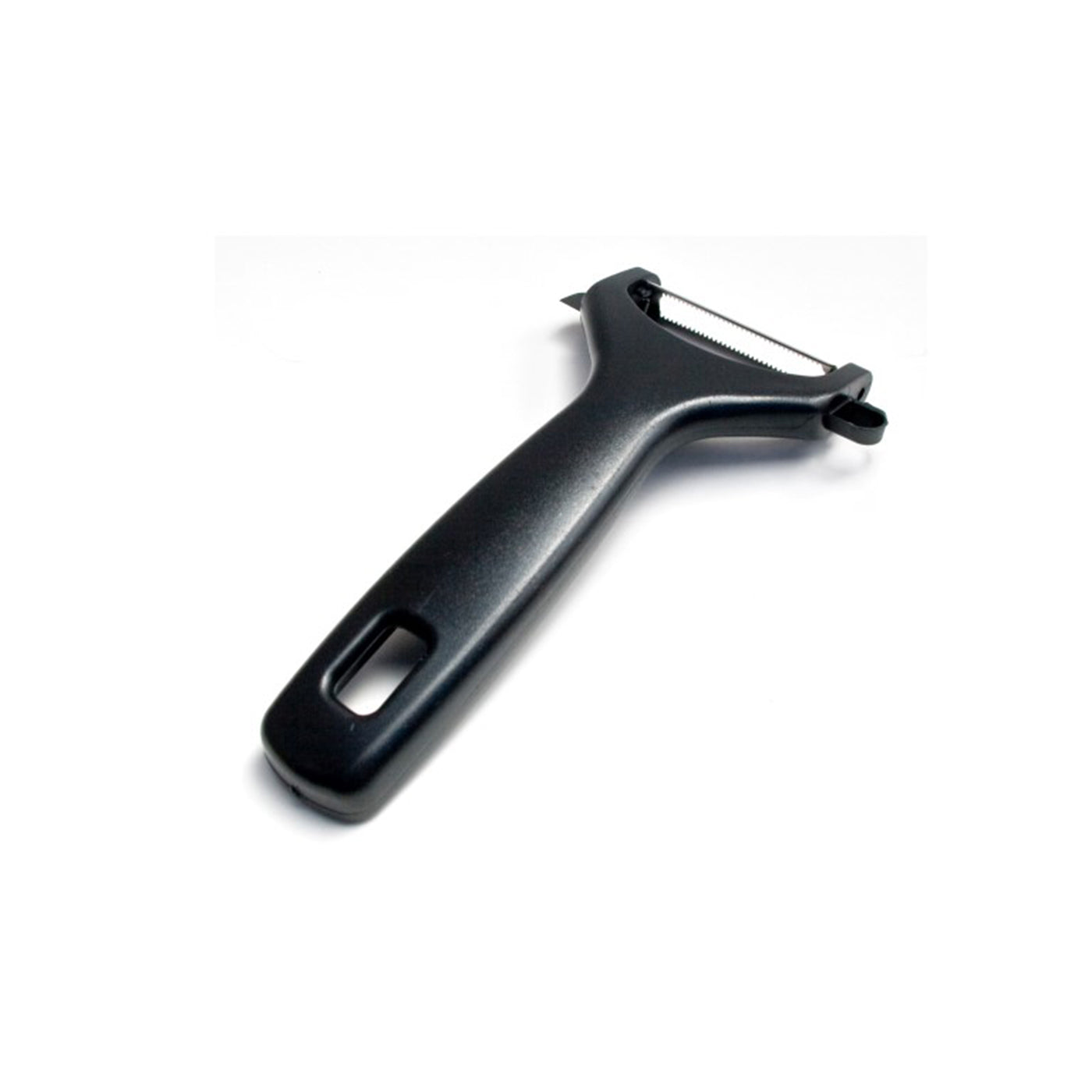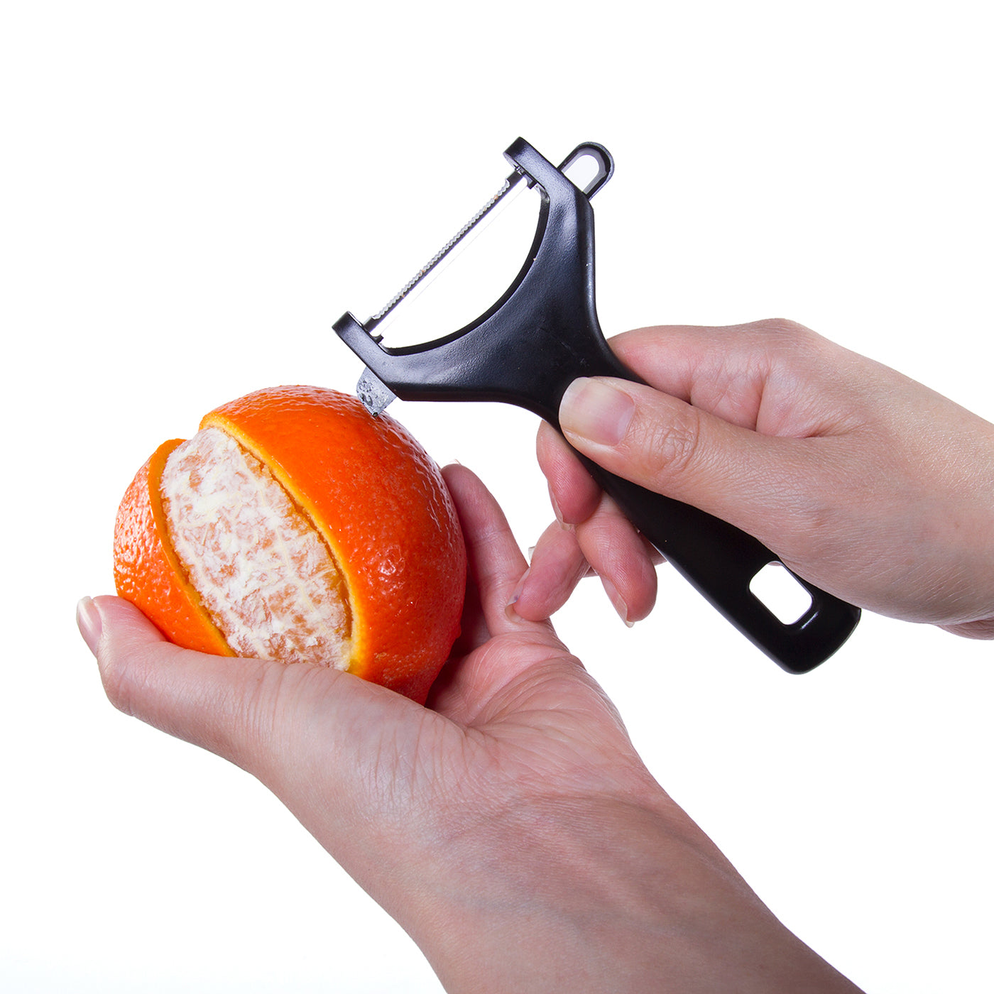 Vegetable peeler with dual serrated blades, built in potato eye remover, and orange peeler.